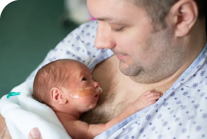 Pour le bébé prématuré, le peau-à-peau avec un des parents est un moment d’amour et de bien-être qui lui permet de réguler sa température corporelle et de grandir.